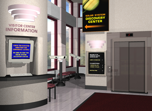 Astronomy Village: Investigating the Solar System — Visitor Center The Visitor Center lobby provides links to conference rooms where students learn about Core Research Projects through video presentations, and formulate class presentations through an interactive press conference. |