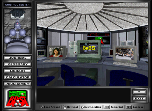 BioBLAST — Lunar Base QTVR Interface As students navigate within the lunar base—the space ship, control center, laboratory, crew quarters, and connecting tunnels—activities are accessible through hotspot navigation links. |