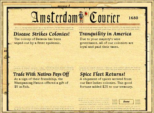| The Colonial Age — Newspapers At the end of each round, significant events are presented in a newspaper format. Some events are the results of decisions made by the students, while others are random, making it necessary for students to reconsider their strategies in future rounds.  |