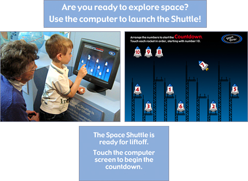 Planets and Stars and Me… Oh My! — Computer Activities Visitors begin their journey through space with hands-on and computer-based counting activities. Touch screen software rewards a successful countdown with a space shuttle launch video. |