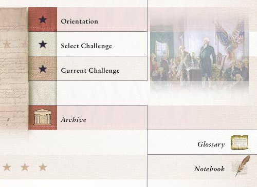 Foundations of Freedom — Main Menu From the main menu, students can navigate to areas where they view orientation materials and select a challenge. They can also open the archive, glossary, and notebook. |