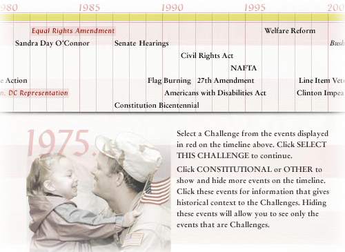 Foundations of Freedom — Timeline The Timeline shows student research challenge topics within their appropriate time periods. Additional events that are relevant to constitutional history can be displayed, as well as other significant social and cultural events of the period. |