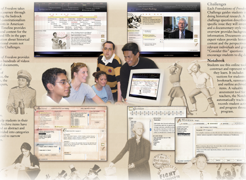 Foundations of Freedom — Promotional Brochure Developed to inform educators about the project, this promotional brochure emphasizes the need for educating students in constitutional history, describes software components, and includes a 17" x 20" classroom poster. |