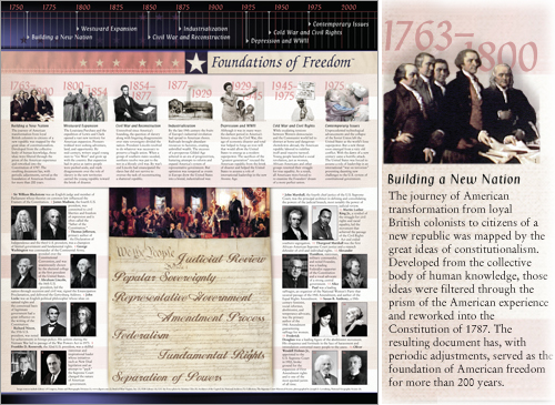Foundations of Freedom — Classroom Poster The inside spread of the promotional poster describes significant time periods in constitutional history, lists major constitutional themes, and provides relevant biographical information about people who played key roles in the history of the Constitution. |