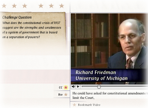 Foundations of Freedom — Expert Interview Video What does the constitutional crisis of 1937 suggest are the strengths and weaknesses of a system of government that is based on a separation of powers? In this video Richard Friedman discusses President Roosevelt’s strategy during the court packing crisis. |