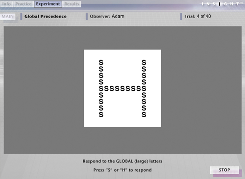 iNSIGHT — Global Precedence Experiment A reaction-time procedure is used to measure different types of information processing by the visual system. This procedure demonstrates how the speed and sequence of visual processing can be measured and shows the relative importance of different attributes of visual images (we see the forest before the trees). |