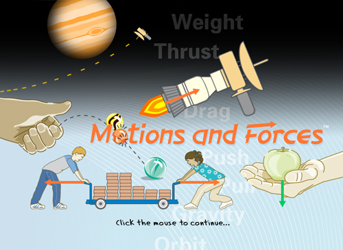 Motions and Forces — Splash Screen Basic terms and concepts such as push, pull, weight, thrust, drag, gravity, and orbit are explained and demonstrated through interactive illustrations and simulations. |