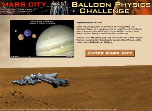 Mars City — Balloon Physics Challenge The home page welcomes space travelers to the Mars City base, where they will work in teams to study Mars science, and to learn the physics of balloons on Earth and on Mars. NASA scientists explain the importance of this journey in the video Why Explore Mars. |