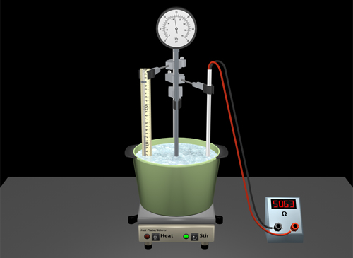 Polyhedron Physics™ — Thermometers Simulation Use an uncalibrated liquid column thermometer, a constant volume gas bulb with an absolute pressure gauge, a thermistor and ohmmeter, a water bath, a hot plate, and ice to investigate the measurement of temperature. |