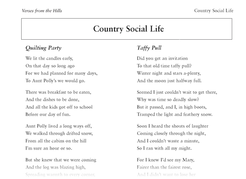 Verses from the Hills People have always found happiness in spending time with their friends and neighbors. In days-gone-by, “get-togethers” were quite different than most are today, often as productive as they were enjoyable. |