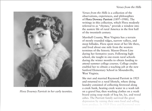 Verses from the Hills While Flora Downey Parriott started writing poems as a grade school student, most of this collection was composed after she was 65 years old. This photo was taken when she was in her early twenties. |