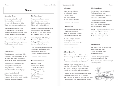 Verses from the Hills Flora expresses her love for our natural world with simple ease. Appreciating and caring for the environment was as important to her as a girl as it is for all of us today. |