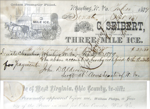 Walking Pleasant Valley — The Early Years Three-Mile Ice Company owner Conrad Seibert and his sons are listed in the 1884 Wheeling City Directory as “ice dealers, with offices on Market Street and in their Pleasant Valley residence 3 Miles East.” This 1879 invoice is for the purhase of ice, “Sold and delivered at the instance and order of the janitor of the State House.” |