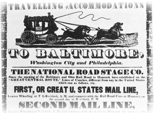 Walking Pleasant Valley — The Early Years Photographs and advertisements are used to illustrate the book. This 1842 advertisement announces schedules and prices of the National Road Stage Company. Fares to Baltimore and Philadelphia were $13 and $15. |
