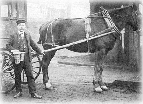 Walking Pleasant Valley — Dimmeydale to Greenwood The neighborhood of Dimmeydale was named after the Dimmey family, owners of a large dairy farm that was once located there. William H. Dimmey (1850–1945) resided with his wife Mary in their home that still stands at 15 Pleasant Drive. This photo shows Dairyman Joseph Dimmey at Wheeling’s Centre market. |